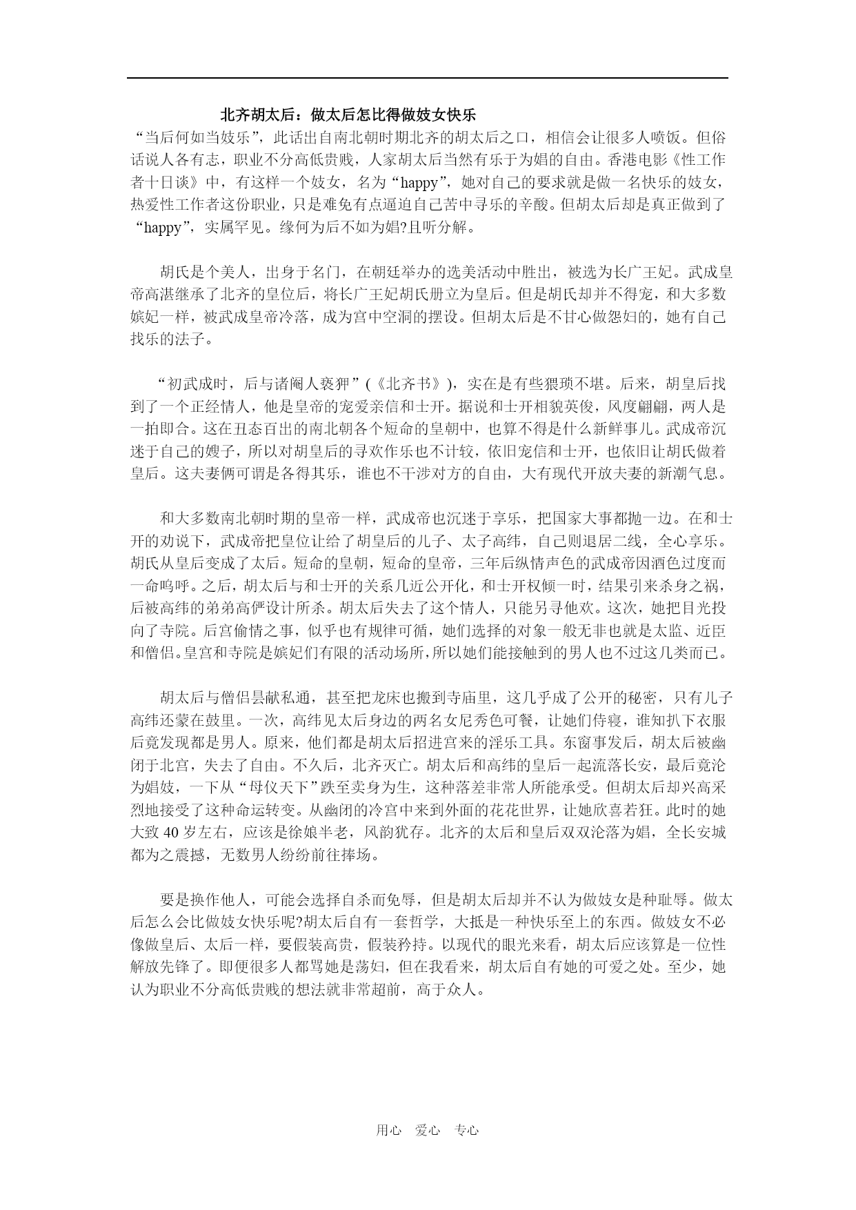 用心爱心专心北齐胡太后:做太后怎比得做妓女快乐“当后何如当妓乐”,此话出自南北朝时期北齐的胡太后之口,相信会让很多人喷饭。但俗话说人各有志,职业不分高低贵贱,人家胡太后当然有乐于为娼的自由。香港电影《性工作者十日谈》中,有这样一个妓女,名为“happy”,她对自己的要求就是做一名快乐的妓女,热爱性工作者这份职业,只是难免有点逼迫自己苦中寻乐的辛酸。但胡太后却是真正做到了“happy”,实属罕见。缘何为后不如为娼?且听分解。胡氏是个美人,出身于名门,在朝廷举办的选美活动中胜出,被选为长广王妃。武成皇帝高湛继