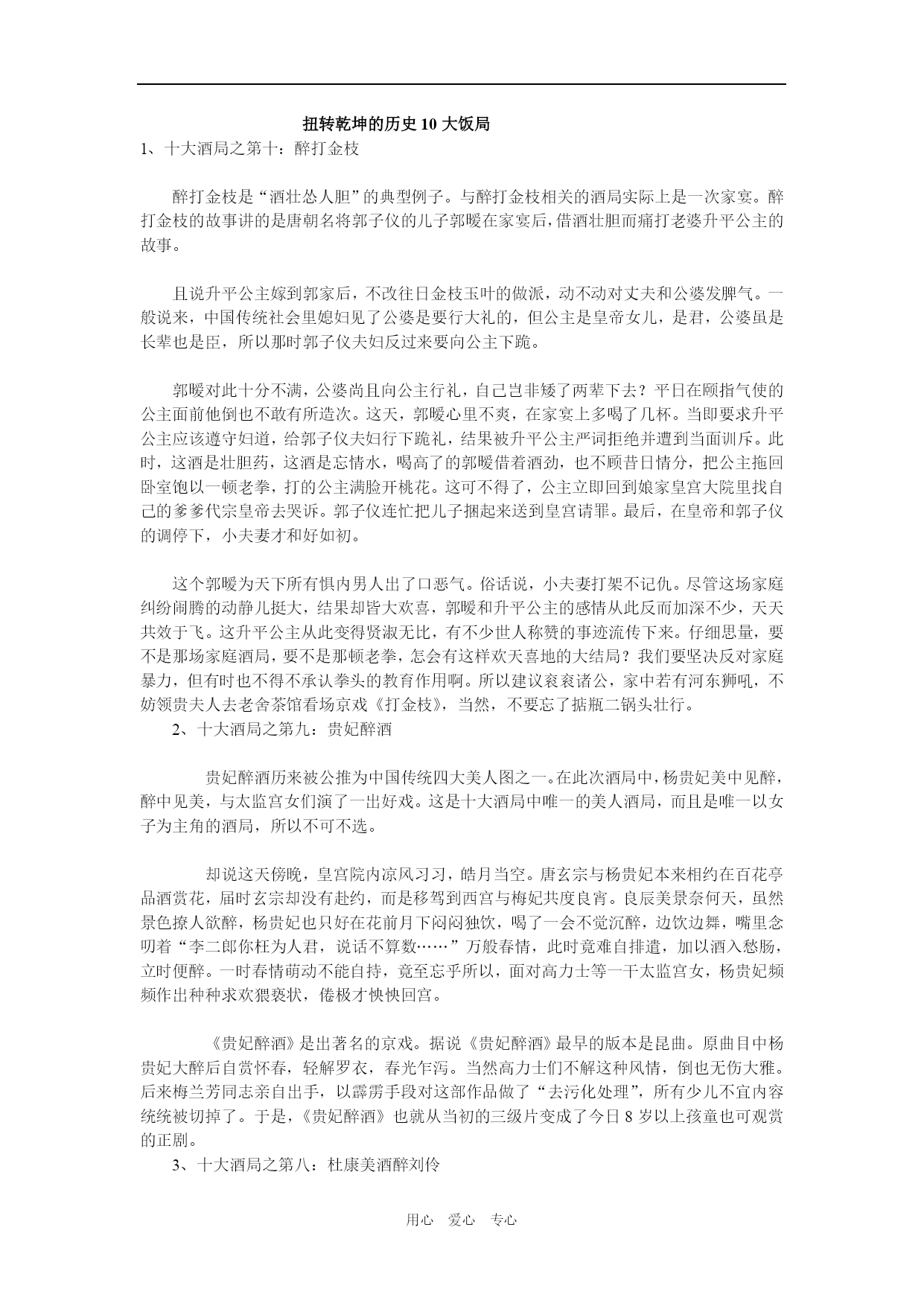 用心爱心专心扭转乾坤的历史10大饭局1、十大酒局之第十:醉打金枝醉打金枝是“酒壮怂人胆”的典型例子。与醉打金枝相关的酒局实际上是一次家宴。醉打金枝的故事讲的是唐朝名将郭子仪的儿子郭暧在家宴后,借酒壮胆而痛打老婆升平公主的故事。且说升平公主嫁到郭家后,不改往日金枝玉叶的做派,动不动对丈夫和公婆发脾气。一般说来,中国传统社会里媳妇见了公婆是要行大礼的,但公主是皇帝女儿,是君,公婆虽是长辈也是臣,所以那时郭子仪夫妇反过来要向公主下跪。郭暧对此十分不满,公婆尚且向公主行礼,自己岂非矮了两辈下去?平日在颐指气使的公