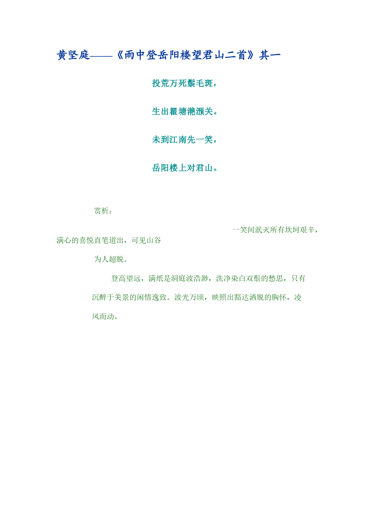 黄坚庭——《雨中登岳阳楼望君山二首》其一投荒万死鬃毛斑,生出瞿塘滟滪关。未到江南先一笑,岳阳楼上对君山。赏析:一笑间泯灭所有坎坷艰辛,满心的喜悦直笔道出,可见山谷为人超脱。登高望远,满纸是洞庭波浩渺,洗净染白双鬃的愁思,只有沉醉于美景的闲情逸致。波光万顷,映照出豁达洒脱的胸怀,凌风而动。
