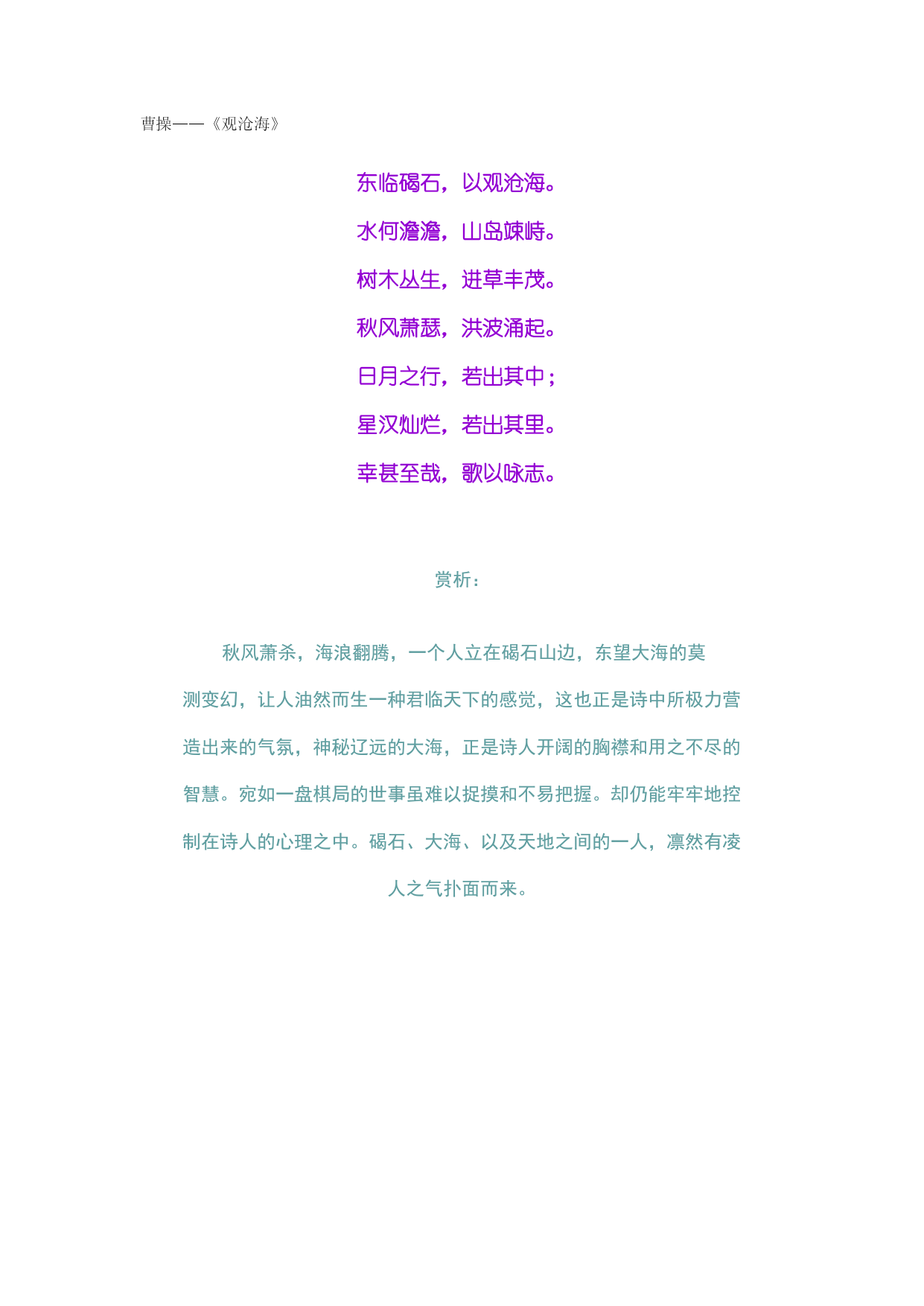曹操——《观沧海》东临碣石,以观沧海。水何澹澹,山岛竦峙。树木丛生,进草丰茂。秋风萧瑟,洪波涌起。日月之行,若出其中;星汉灿烂,若出其里。幸甚至哉,歌以咏志。赏析:秋风萧杀,海浪翻腾,一个人立在碣石山边,东望大海的莫测变幻,让人油然而生一种君临天下的感觉,这也正是诗中所极力营造出来的气氛,神秘辽远的大海,正是诗人开阔的胸襟和用之不尽的智慧。宛如一盘棋局的世事虽难以捉摸和不易把握。却仍能牢牢地控制在诗人的心理之中。碣石、大海、以及天地之间的一人,凛然有凌人之气扑面而来。