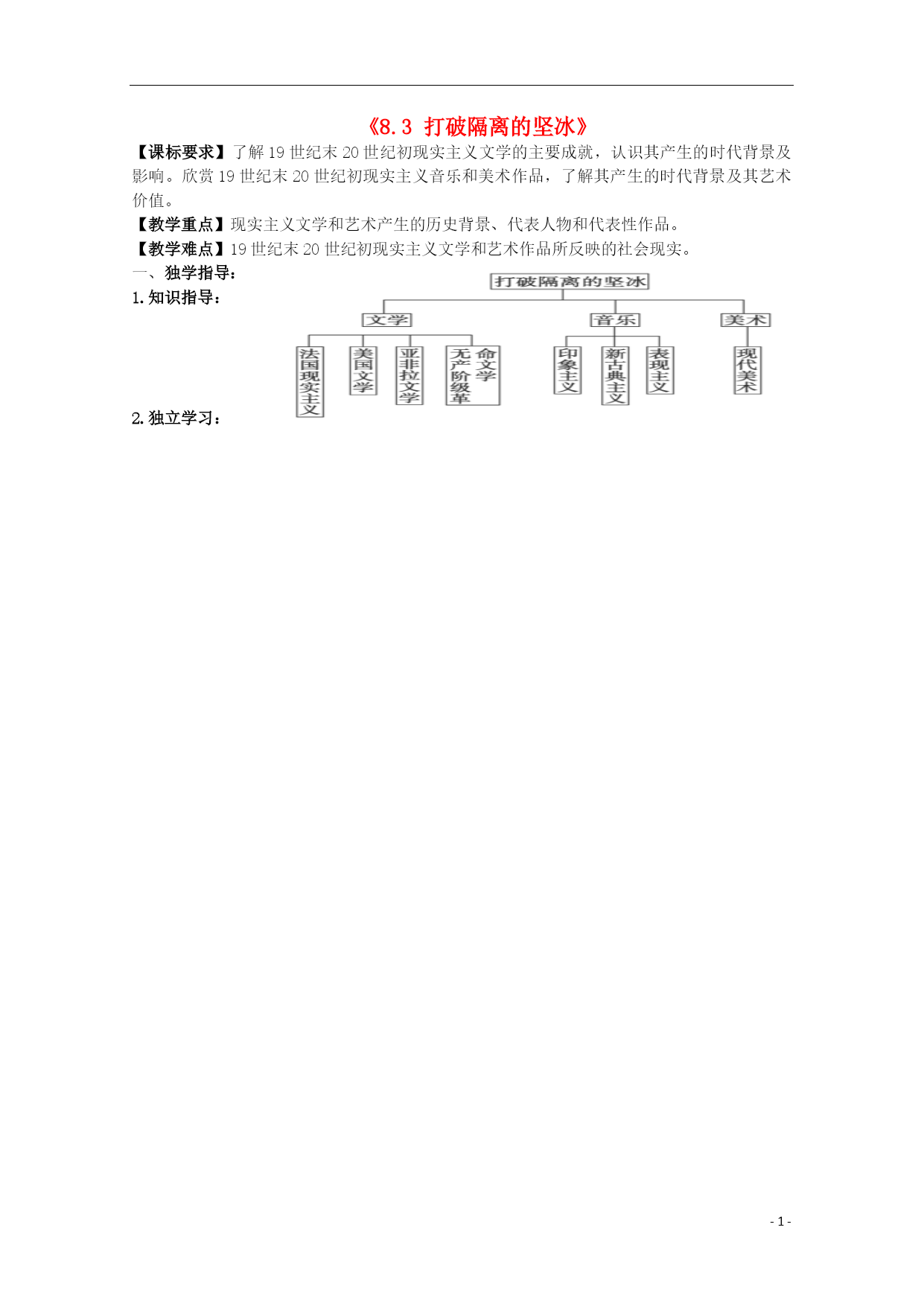 PAGE-2-《8.3打破隔离的坚冰》【课标要求】了解19世纪末20世纪初现实主义文学的主要成就,认识其产生的时代背景及影响。欣赏19世纪末20世纪初现实主义音乐和美术作品,了解其产生的时代背景及其艺术价值。【教学重点】现实主义文学和艺术产生的历史背景、代表人物和代表性作品。【教学难点】19世纪末20世纪初现实主义文学和艺术作品所反映的社会现实。一、独学指导:1.知识指导:2.独立学习:3.抛砖引玉:PAGE-6-抛出问题引出问题1).19世纪以来西方流行的主要美术流派、特点及其代表作2).关