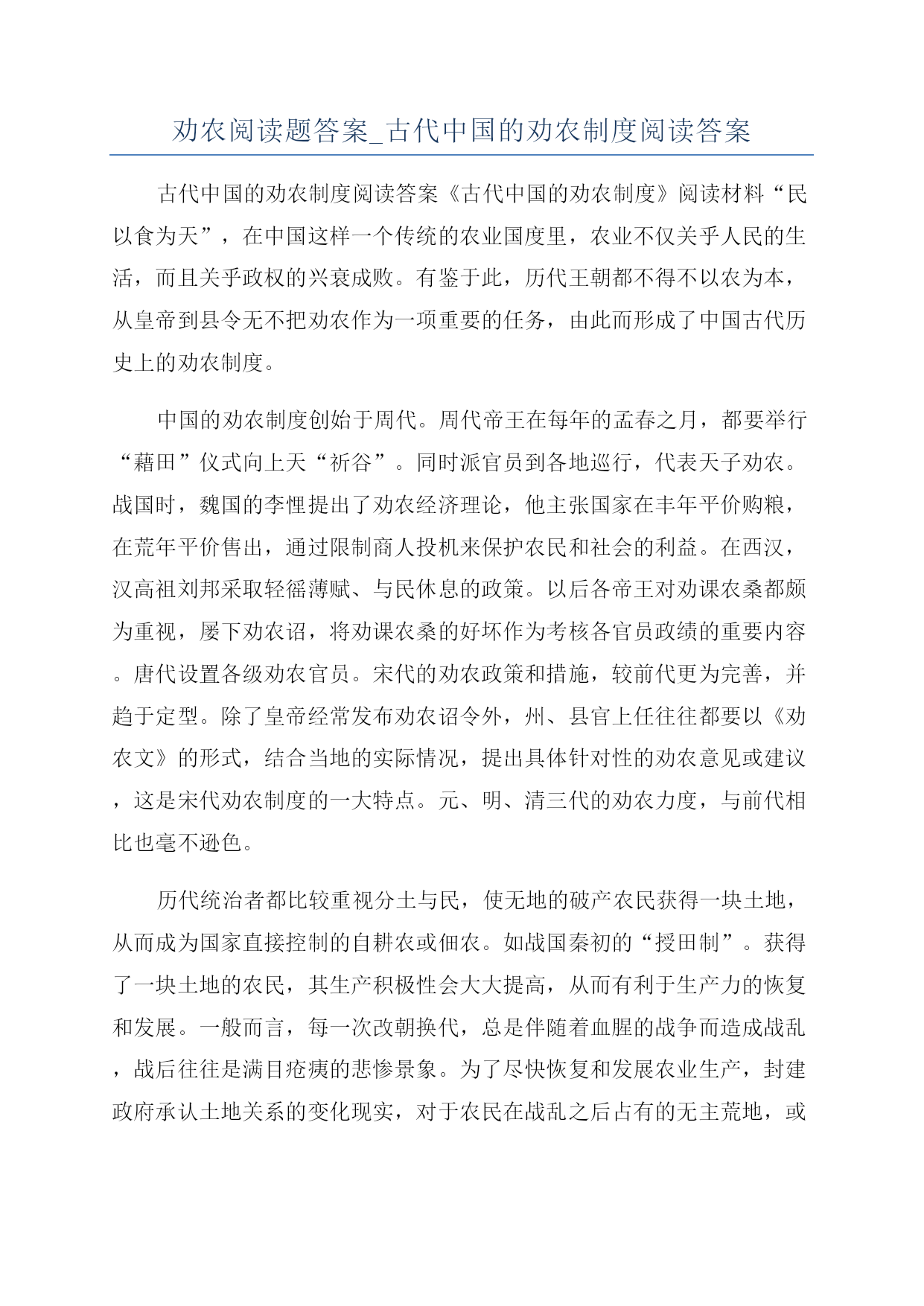 劝农阅读题答案_古代中国的劝农制度阅读答案古代中国的劝农制度阅读答案《古代中国的劝农制度》阅读材料“民以食为天”,在中国这样一个传统的农业国度里,农业不仅关乎人民的生活,而且关乎政权的兴衰成败。有鉴于此,历代王朝都不得不以农为本,从皇帝到县令无不把劝农作为一项重要的任务,由此而形成了中国古代历史上的劝农制度。中国的劝农制度创始于周代。周代帝王在每年的孟春之月,都要举行“藉田”仪式向上天“祈谷”。同时派官员到各地巡行,代表天子劝农。战国时,魏国的李悝提出了劝农经济理论,他主张国家在丰年平价购粮,在荒年平价售