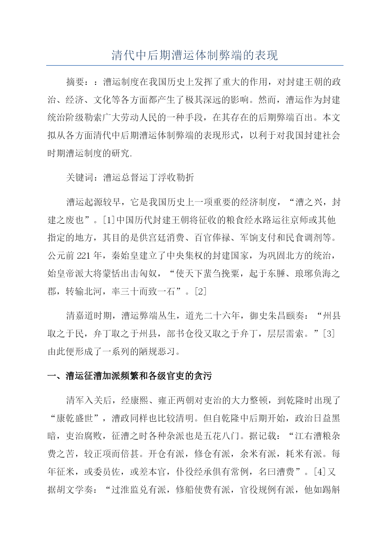 清代中后期漕运体制弊端的表现摘要::漕运制度在我国历史上发挥了重大的作用,对封建王朝的政治、经济、文化等各方面都产生了极其深远的影响。然而,漕运作为封建统治阶级勒索广大劳动人民的一种手段,在其存在的后期弊端百出。本文拟从各方面清代中后期漕运体制弊端的表现形式,以利于对我国封建社会时期漕运制度的研究.关键词:漕运总督运丁浮收勒折漕运起源较早,它是我国历史上一项重要的经济制度,“漕之兴,封建之废也”。[1]中国历代封建王朝将征收的粮食经水路运往京师或其他指定的地方,其目的是供宫廷消费、百官俸禄、军饷支付和民食