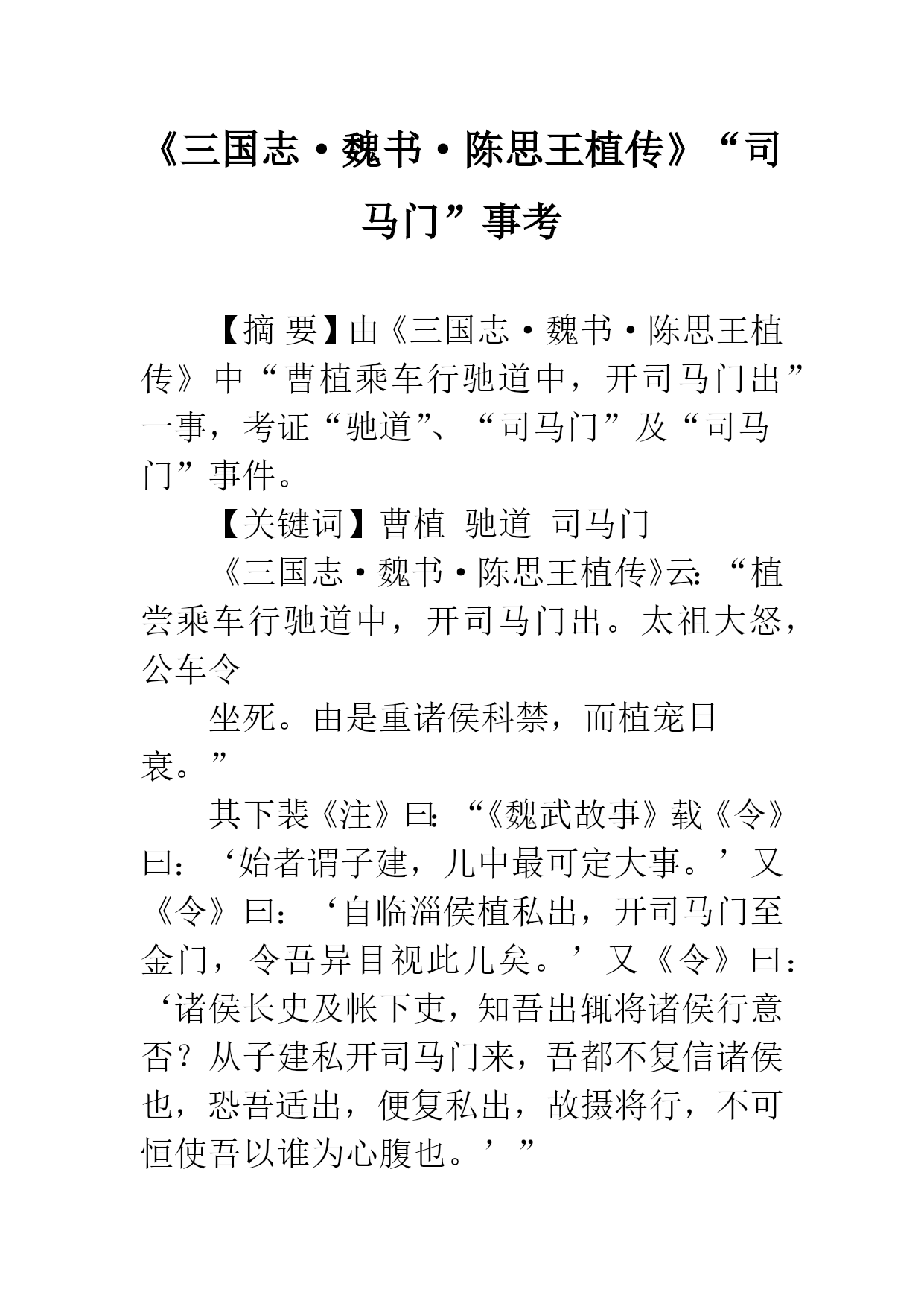 《三国志·魏书·陈思王植传》“司马门”事考【摘要】由《三国志·魏书·陈思王植传》中“曹植乘车行驰道中,开司马门出”一事,考证“驰道”、“司马门”及“司马门”事件。【关键词】曹植驰道司马门《三国志·魏书·陈思王植传》云:“植尝乘车行驰道中,开司马门出。太祖大怒,公车令坐死。由是重诸侯科禁,而植宠日衰。”其下裴《注》曰:“《魏武故事》载《令》曰:‘始者谓子建,儿中最可定大事。’又《令》曰:‘自临淄侯植私出,开司马门至金门,令吾异目视此儿矣。’又《令》曰:‘诸侯长史及帐下吏,知吾出辄将诸侯行意否?从子建私开司马