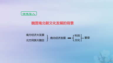 魏晋南北朝的科技与文化1.圆周率2.天文历法《大明历》最早将岁差引进历法;提出了用圭表测量正午太阳影长以定冬至时刻的方法;并采用了391年加144个闰月的新闰周。是当时最先进的历法。祖冲之环形山《兰亭集序》摹本书体的演变2.绘画3.雕塑魏晋南北朝时期文化发展的原因是什么?精典题例课堂小结