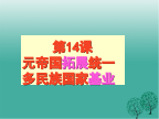 第14课元帝国拓展统一多民族国家基业吐蕃诸部一、“一代天骄”的崛起蒙古族传统的“男儿三技”和游牧生活的习惯,都使蒙古人成为勇猛能耐的战士。内——各部混战外——女真(金)压迫成吉思汗1、完成了蒙古的统一大业。2、建立了强大的蒙古政权。3、领导蒙古人民反抗金的压迫。4、实行军政合一的国家体制。5、统治期间,创制了蒙古文字。一代天骄,成吉思汗。——毛泽东《沁园春·雪》成吉思汗之死元朝统一全国过零丁洋辛苦遭逢起一经,干戈寥落四周星。山河破碎风飘絮,身世沉浮雨打萍。惶恐滩头说惶恐,零丁洋里叹零丁。人生自古谁无死,留