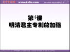 第4课明清君主专制的加强官员上朝礼仪的变化明清君主专制的加强(一)明朝废丞相,设内阁1、明太祖废丞相(1)背景:①丞相权势过重,威胁皇权;②明太祖废行省,设三司。加强了中央集权,宰相的实权扩大了;③丞相胡惟庸擅权专恣。1、明太祖废丞相(1)背景:(2)过程:1380年,明太祖诛杀胡惟庸,裁撤中书省和丞相,以六部分理全国政务,直接对皇帝负责。阅读资料回放,说说明太祖废丞相的根本原因是什么?1、明太祖废丞相(1)背景:(2)过程:(3)影响:1、明太祖废丞相2、内阁的出现时期明成祖朱棣张居正比较宰相制与内阁制