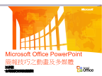 MicrosoftOfficePowerPoint簡報技巧之動畫及多媒體Agenda早期站在講台上,口沫橫飛振振有辭的直述中期拉下布簾(銀幕),放台投影機或幻燈機,每頁數行、每行十數個文字的文字稿,影印成一張張的投影片,就算是坐在最前排的貴賓席,也要撐大雙眼,甚至費神的以雙手拉開眼皮與眼袋,還都看不太清楚寫了些什麼現代利用多媒體輔助工具,影像、音效、再加上迷人的說服口才、溝通技巧,成為PRO級的演講者什麼人需要做簡報簡報的好處簡報對企業的好處成功的簡報流程製作簡報教材前的準備簡報的目的正確的運用圖表確認主