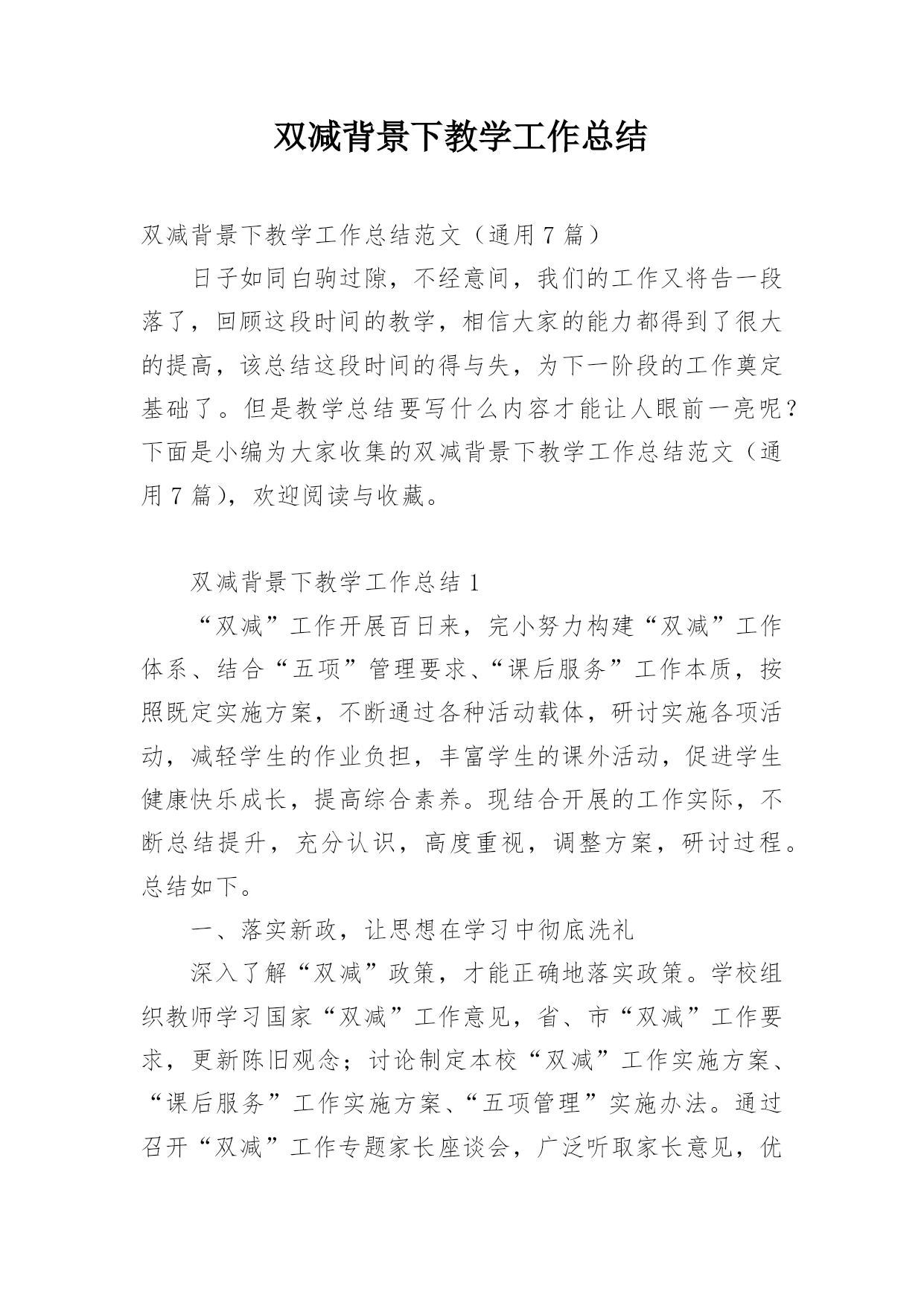 双减背景下教学工作总结双减背景下教学工作总结范文(通用7篇)日子如同白驹过隙,不经意间,我们的工作又将告一段落了,回顾这段时间的教学,相信大家的能力都得到了很大的提高,该总结这段时间的得与失,为下一阶段的工作奠定基础了。但是教学总结要写什么内容才能让人眼前一亮呢?下面是小编为大家收集的双减背景下教学工作总结范文(通用7篇),欢迎阅读与收藏。双减背景下教学工作总结1“双减”工作开展百日来,完小努力构建“双减”工作体系、结合“五项”管理要求、“课后服务”工作本质,按照既定实施方案,不断通过各种活动载体,研讨实