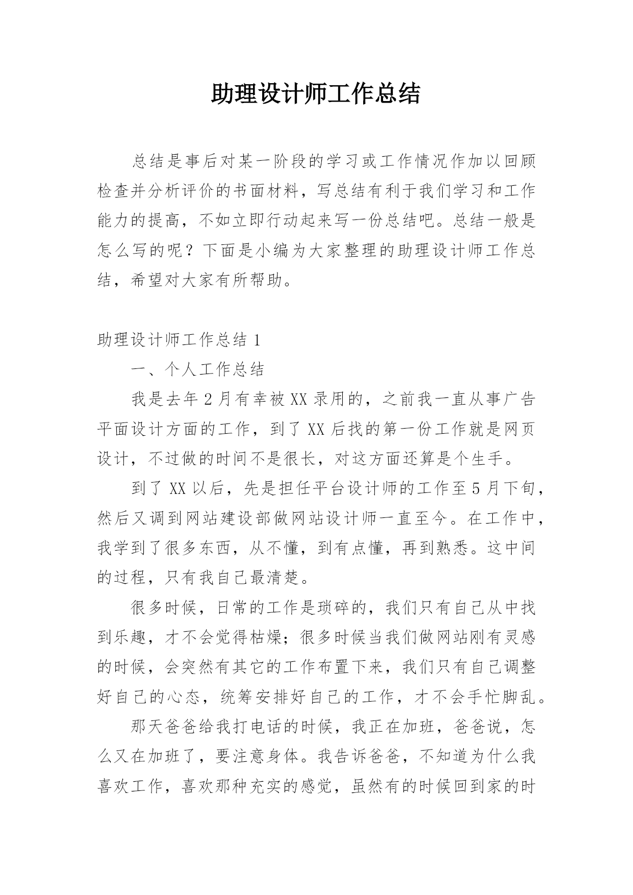 助理设计师工作总结总结是事后对某一阶段的学习或工作情况作加以回顾检查并分析评价的书面材料,写总结有利于我们学习和工作能力的提高,不如立即行动起来写一份总结吧。总结一般是怎么写的呢?下面是小编为大家整理的助理设计师工作总结,希望对大家有所帮助。助理设计师工作总结1一、个人工作总结我是去年2月有幸被XX录用的,之前我一直从事广告平面设计方面的工作,到了XX后找的第一份工作就是网页设计,不过做的时间不是很长,对这方面还算是个生手。到了XX以后,先是担任平台设计师的工作至5月下旬,然后又调到网站建设部做网站设计师