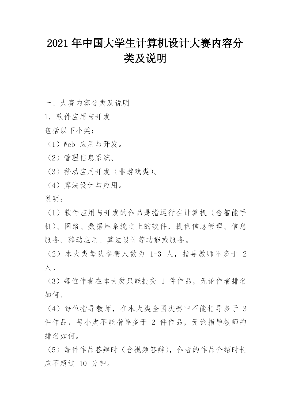 2021年中国大学生计算机设计大赛内容分类及说明一、大赛内容分类及说明1.软件应用与开发包括以下小类:(1)Web应用与开发。(2)管理信息系统。(3)移动应用开发(非游戏类)。(4)算法设计与应用。说明:(1)软件应用与开发的作品是指运行在计算机(含智能手机)、网络、数据库系统之上的软件,提供信息管理、信息服务、移动应用、算法设计等功能或服务。(2)本大类每队参赛人数为1-3人,指导教师不多于2人。(3)每位作者在本大类只能提交1件作品,无论作者排名如何。(4)每位指导教师,在本大类全国决赛中不能指导多