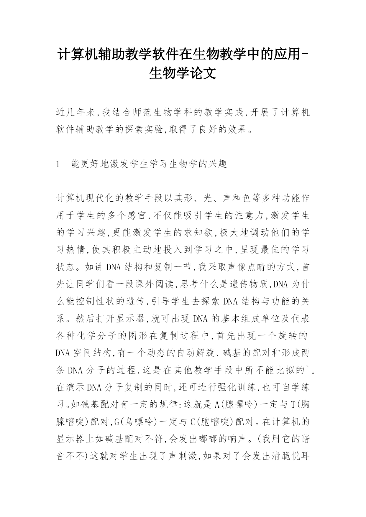 计算机辅助教学软件在生物教学中的应用-生物学论文近几年来,我结合师范生物学科的教学实践,开展了计算机软件辅助教学的探索实验,取得了良好的效果。1能更好地激发学生学习生物学的兴趣计算机现代化的教学手段以其形、光、声和色等多种功能作用于学生的多个感官,不仅能吸引学生的注意力,激发学生的学习兴趣,更能激发学生的求知欲,极大地调动他们的学习热情,使其积极主动地投入到学习之中,呈现最佳的学习状态。如讲DNA结构和复制一节,我采取声像点睛的方式,首先让同学们看一段课外阅读,思考什么是遗传物质,DNA为什么能控制性状的