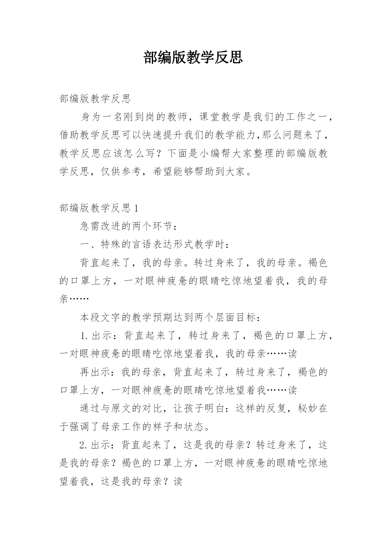 部编版教学反思部编版教学反思身为一名刚到岗的教师,课堂教学是我们的工作之一,借助教学反思可以快速提升我们的教学能力,那么问题来了,教学反思应该怎么写?下面是小编帮大家整理的部编版教学反思,仅供参考,希望能够帮助到大家。部编版教学反思1急需改进的两个环节:一、特殊的言语表达形式教学时:背直起来了,我的母亲。转过身来了,我的母亲。褐色的口罩上方,一对眼神疲惫的眼睛吃惊地望着我,我的母亲……本段文字的教学预期达到两个层面目标:1.出示:背直起来了,转过身来了,褐色的口罩上方,一对眼神疲惫的眼睛吃惊地望着我,我的