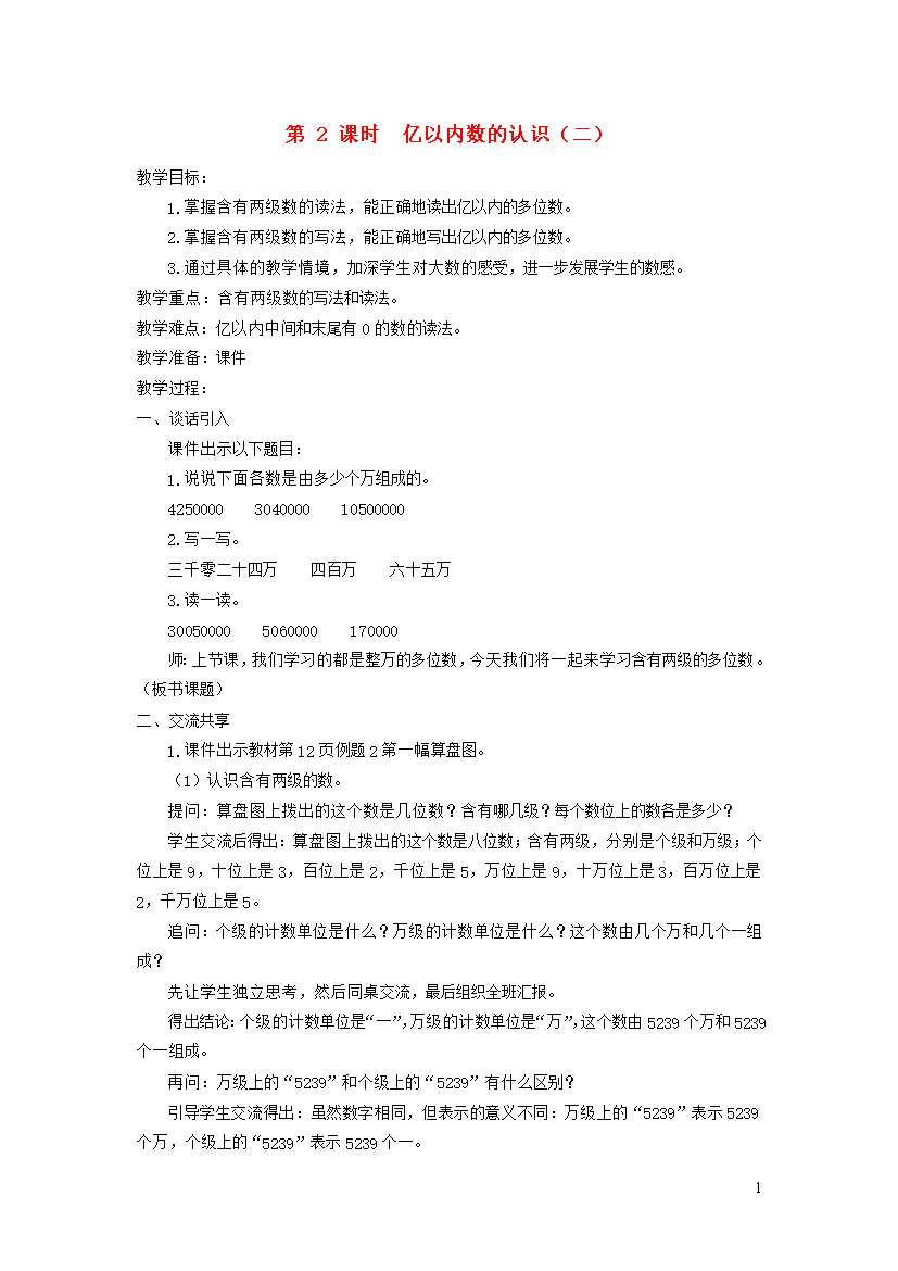 教案-全国-2019_2019年四年级数学下册 第二单元 认识多位数 第2课时 亿以内数的认识(二)教案设计 苏教版