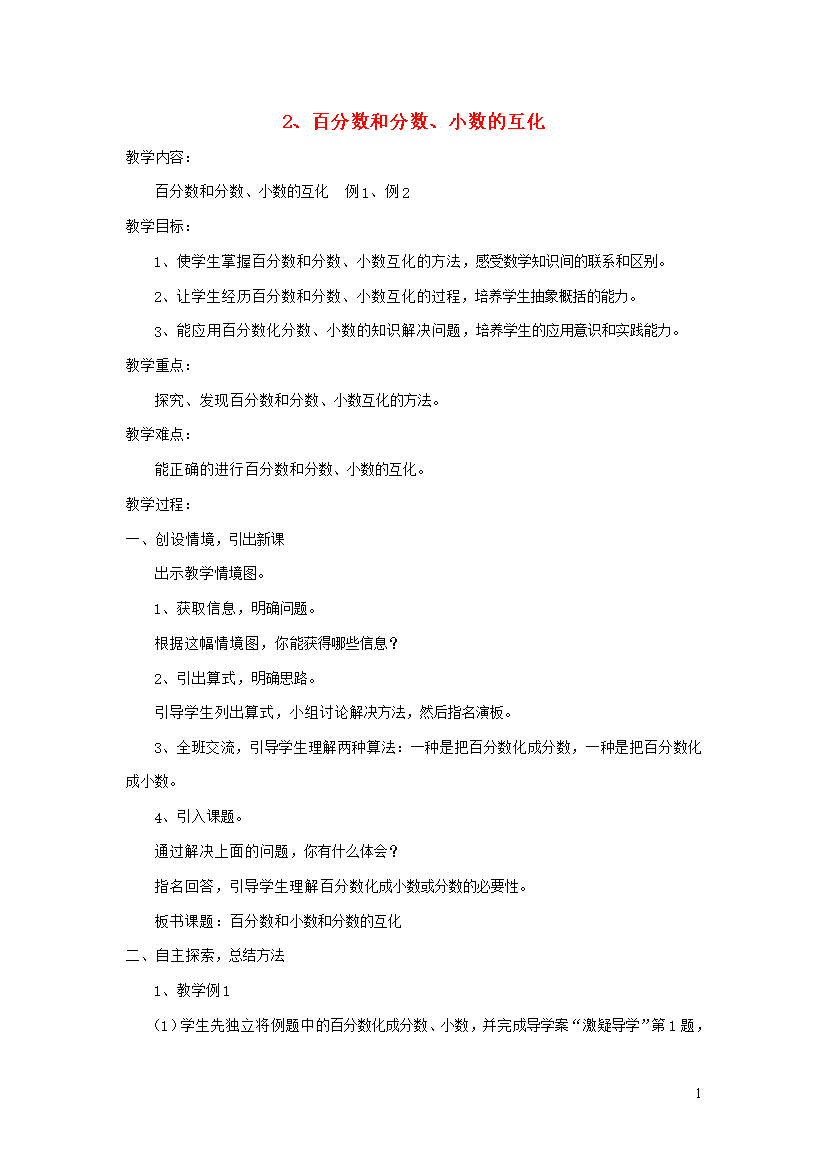 教案-全国-2019_六年级数学下册 第一单元 百分数 2 百分数和分数、小数的互化教案 西师大版