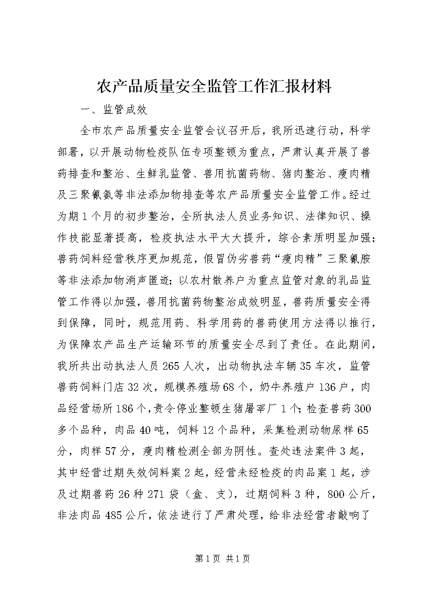 农产品质量安全监管工作汇报材料