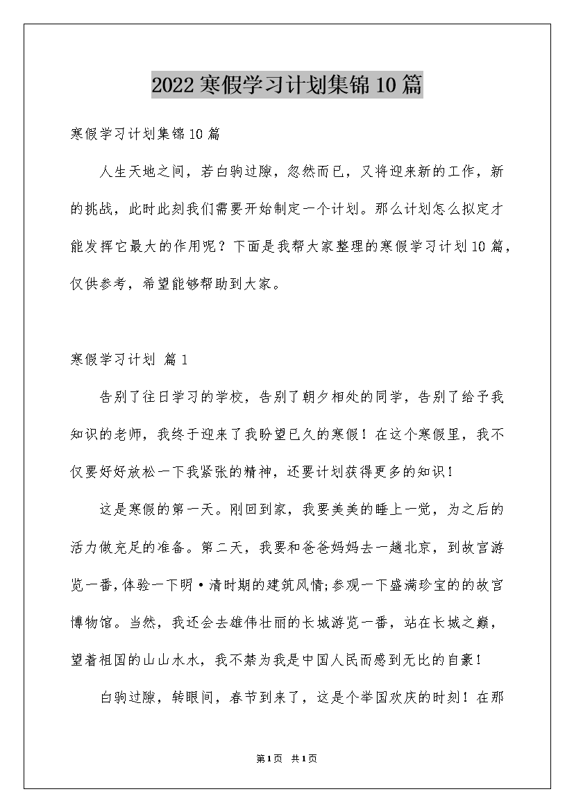 2022寒假学习计划集锦10篇
