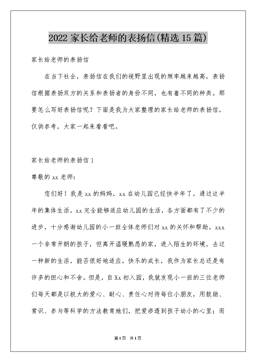 2022家长给老师的表扬信(精选15篇)