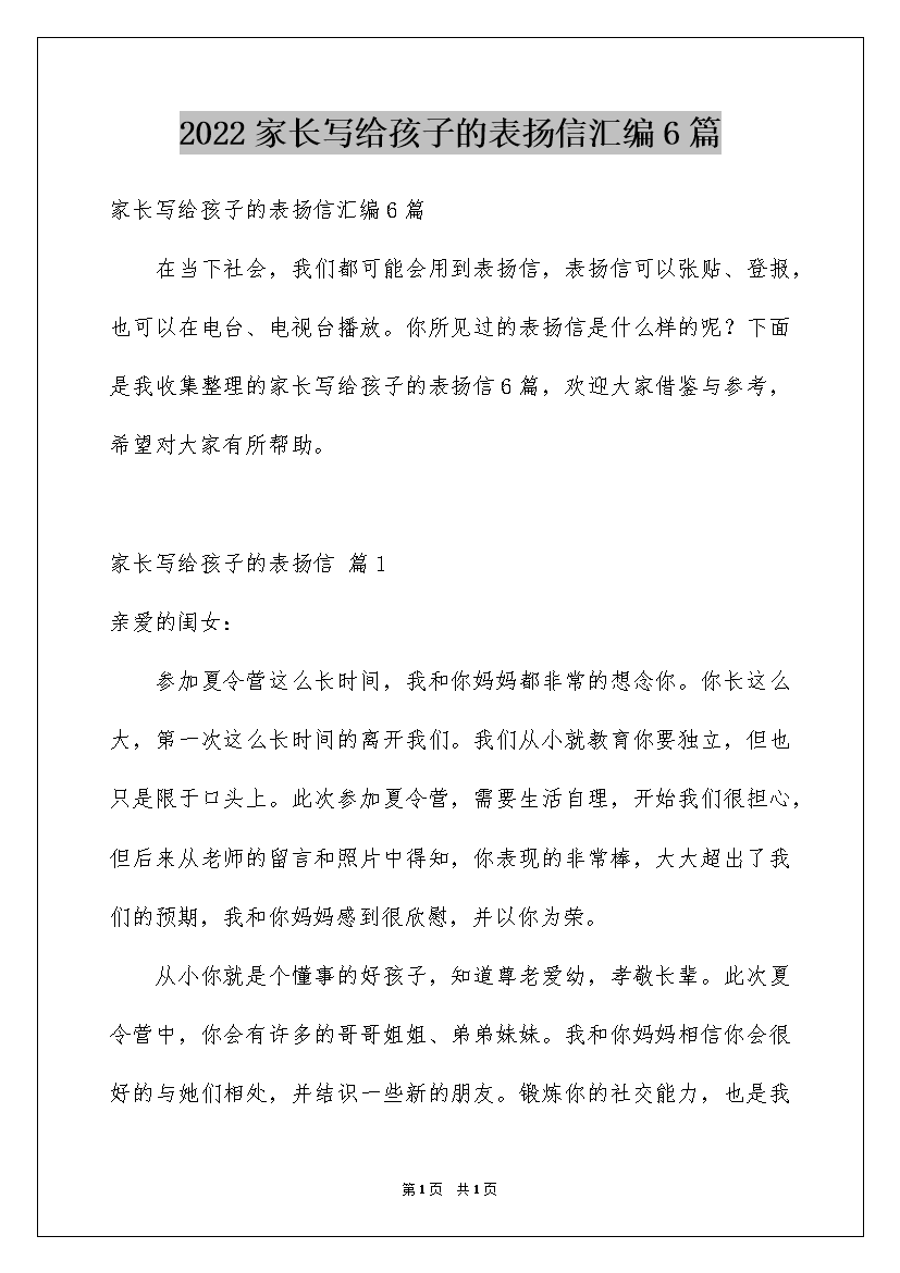 2022家长写给孩子的表扬信汇编6篇