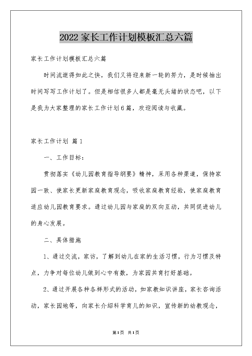 2022家长工作计划模板汇总六篇