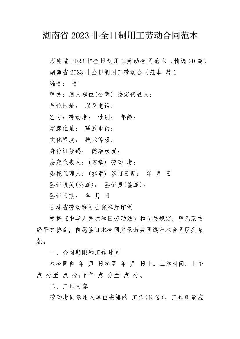 湖南省2023非全日制用工劳动合同范本