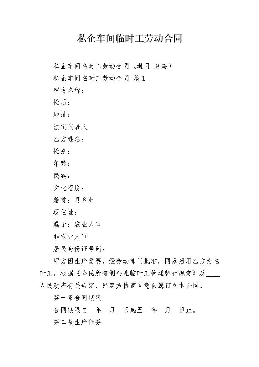 私企车间临时工劳动合同