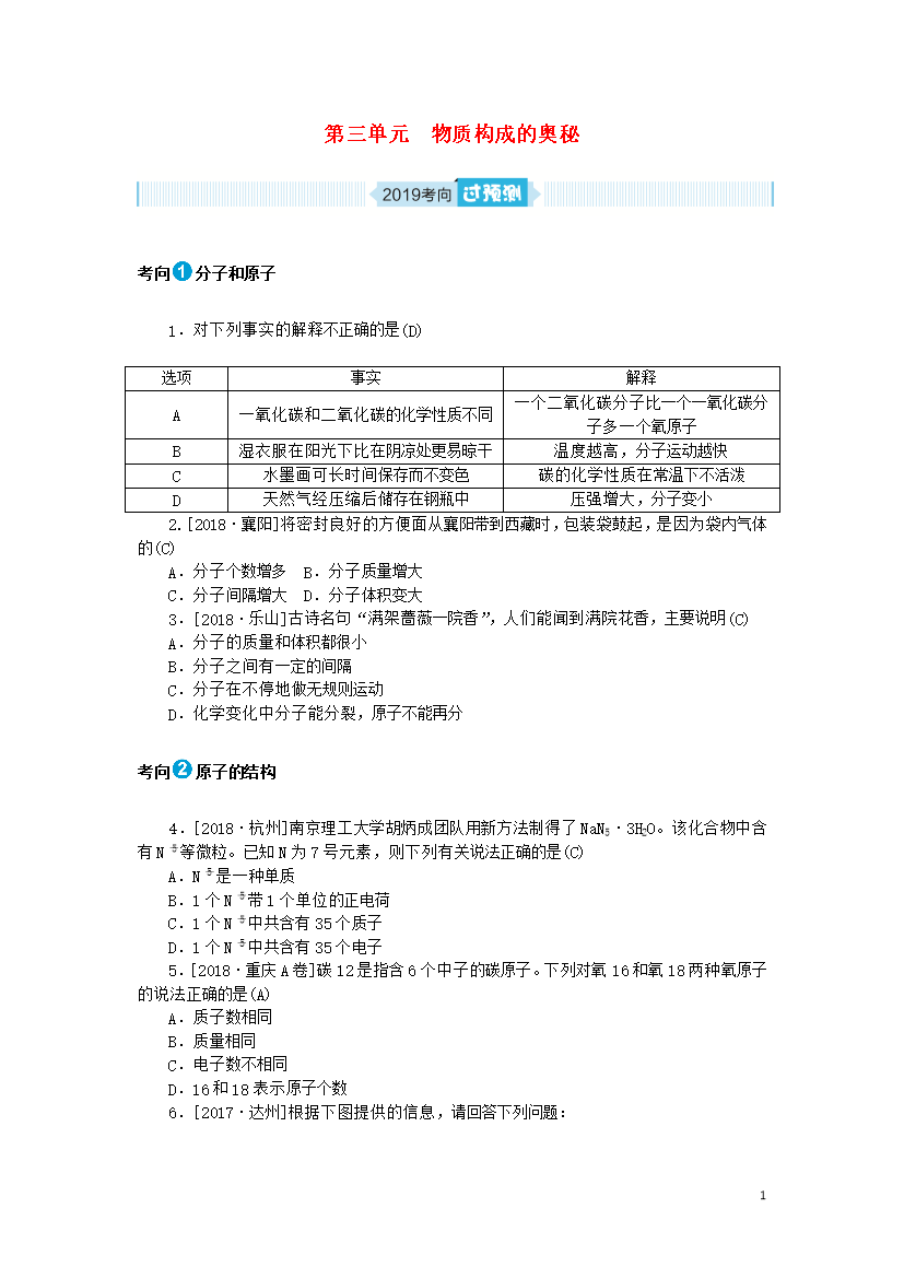 试题-安徽-2019_安徽省2019年中考化学复习 第三单元 物质构成的奥秘练习