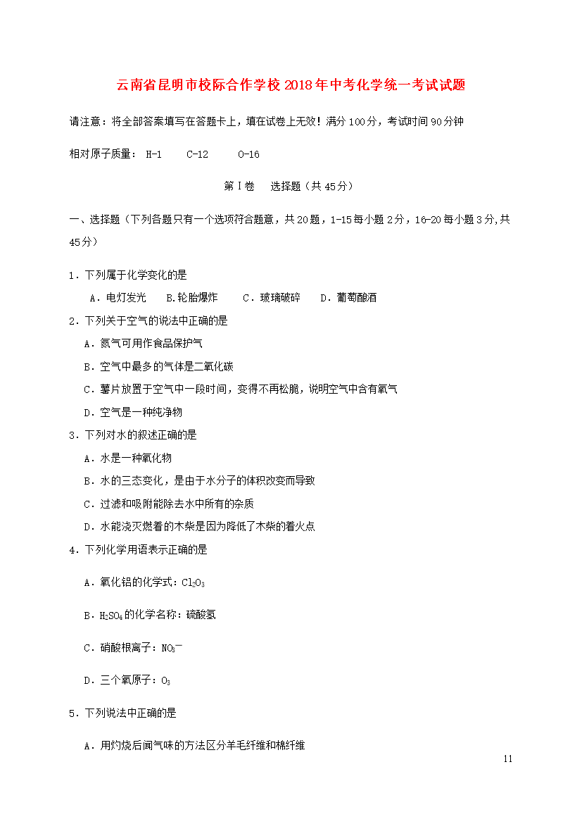 试题-云南-2018_云南省昆明市校际合作学校2018年中考化学统一考试试题