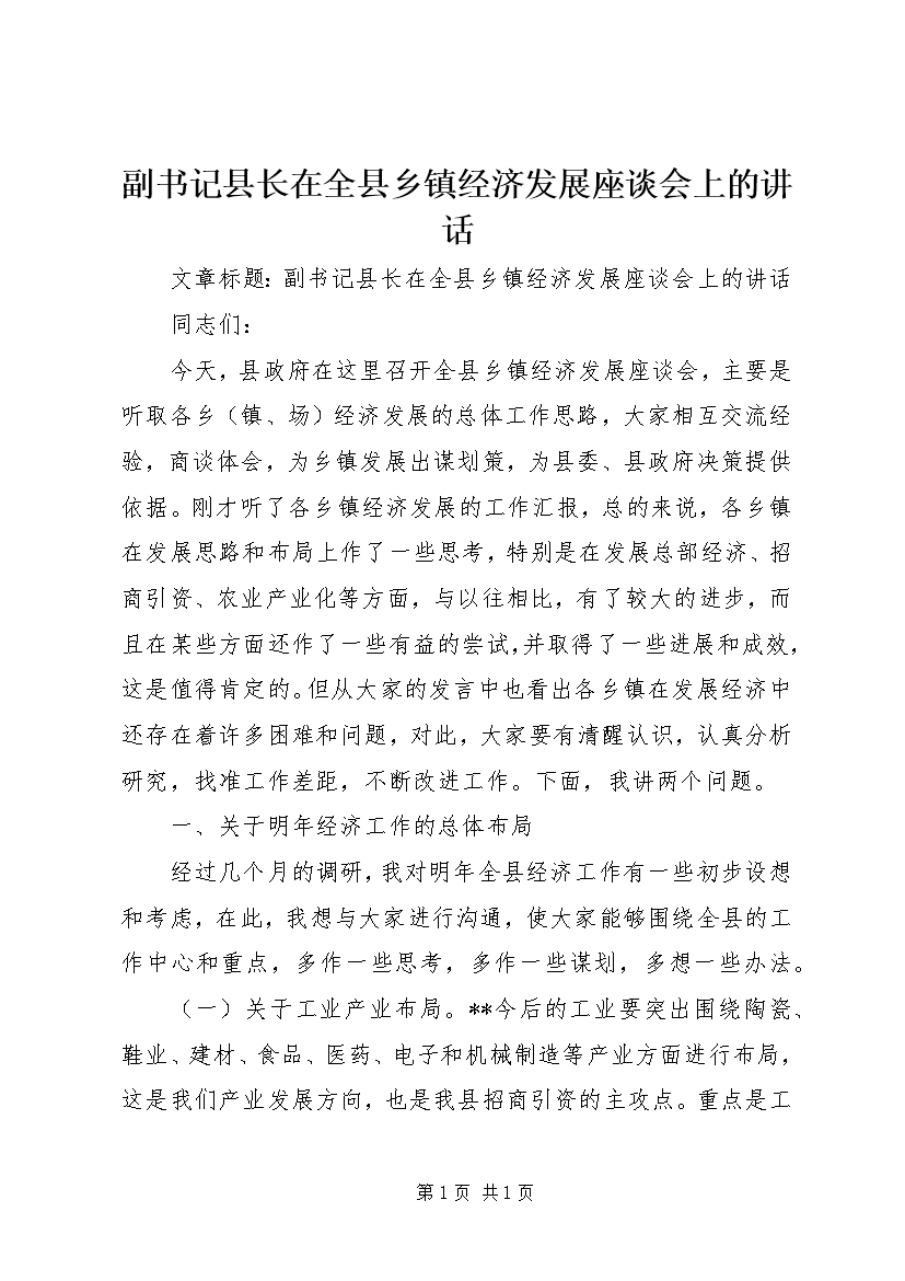 副书记县长在全县乡镇经济发展座谈会上的讲话