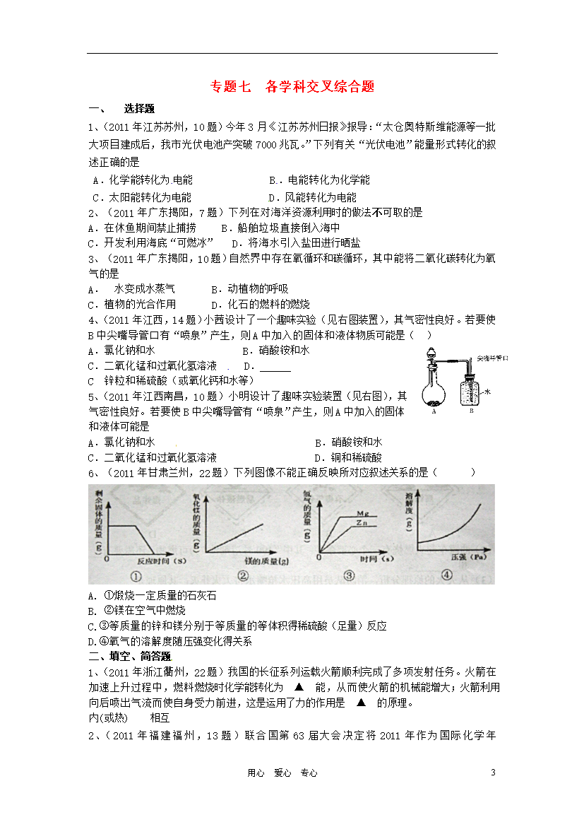 试题-全国-2011_9月最新修订版2011全国各地中考化学试题分类汇编 专题7各学科交叉综合题