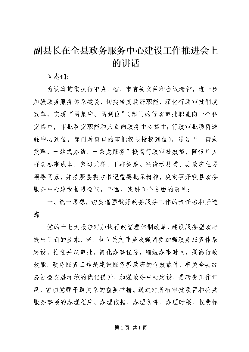 副县长在全县政务服务中心建设工作推进会上的讲话_1