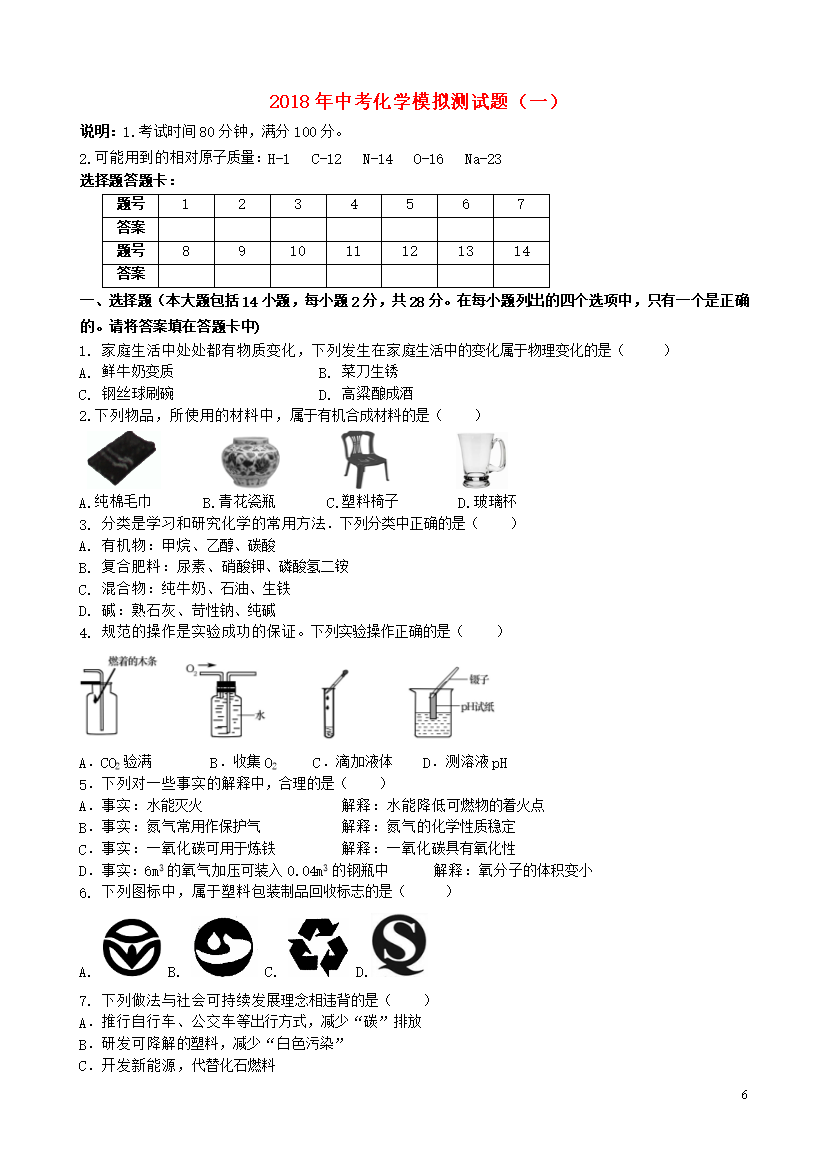 试题-四川-2018_四川省成都市简阳市2018年中考化学模拟测试题(一)