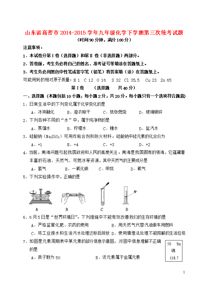 试题-山东-2015_山东省高密市2014-2015学年九年级化学下学期第三次统考试题
