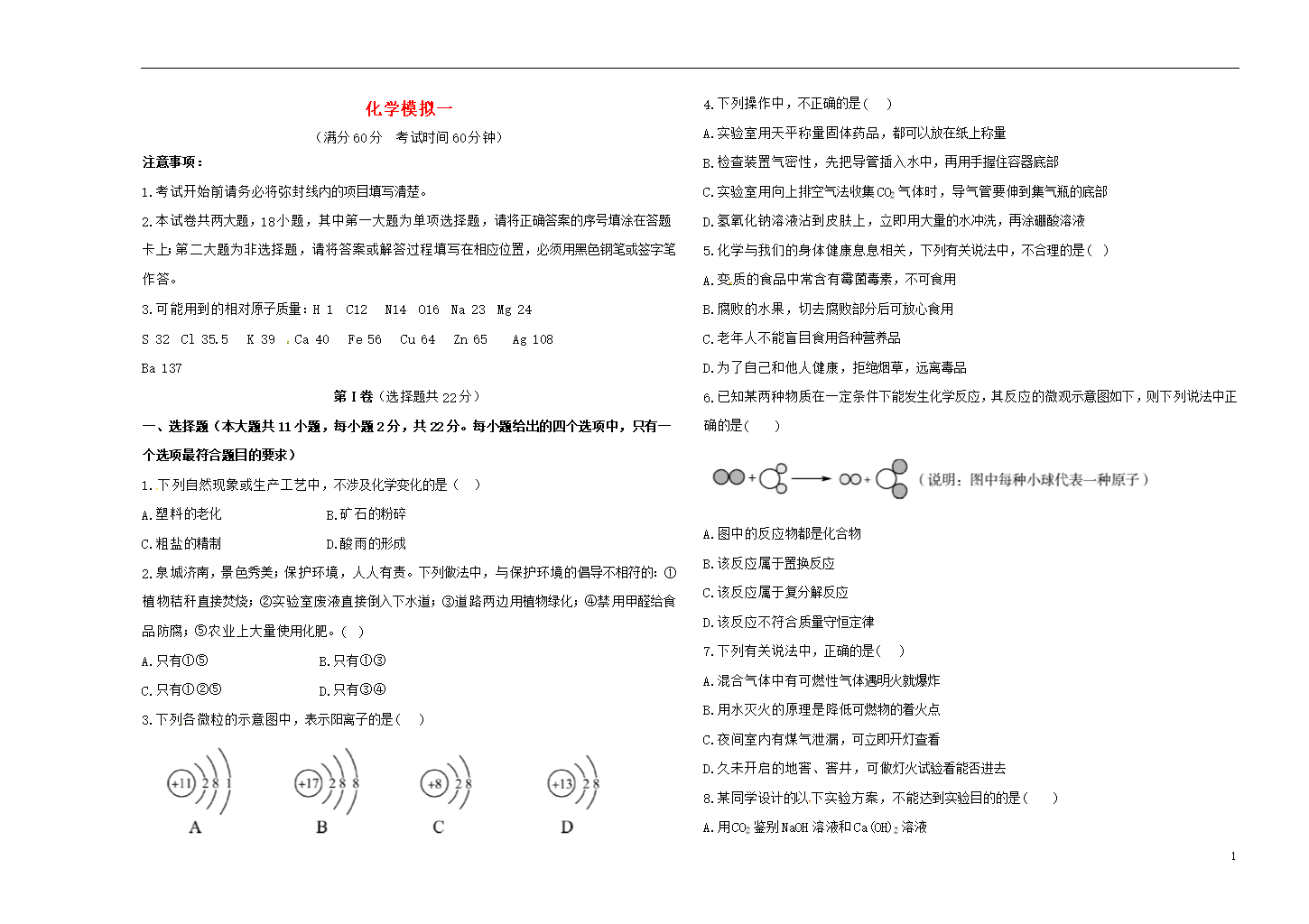 试题-山东-2017_山东省2017年中考化学总复习 模拟一