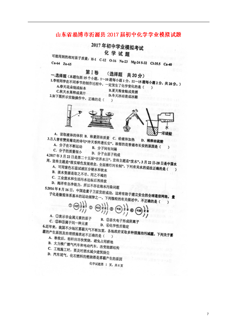 试题-山东-2017_山东省淄博市沂源县2017届初中化学学业模拟试题(扫描版)
