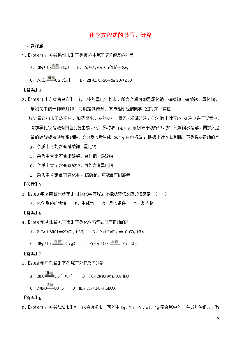 试题-全国-2018_2018年中考化学知识分类练习卷 化学方程式的书写、计算