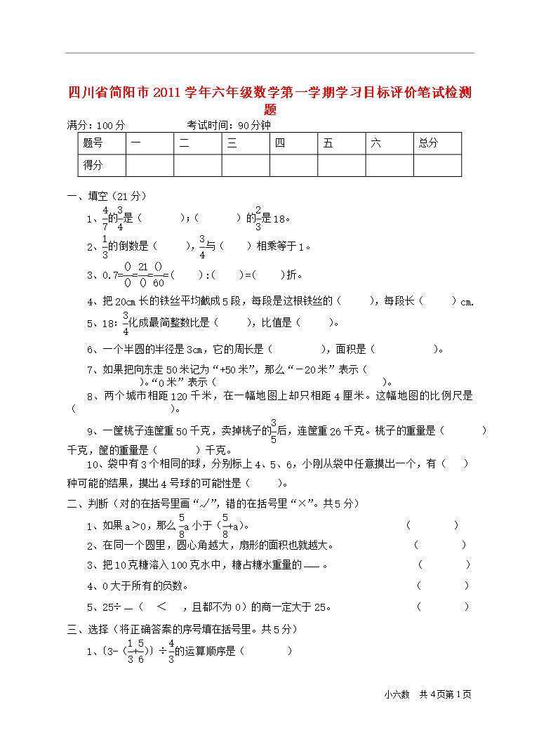 试题-四川-2013_四川省简阳市2011学年六年级数学第一学期学习目标评价笔试检测题
