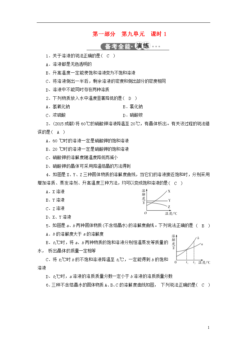 试题-云南-2015_中考新突破云南省2016中考化学 第一部分 第9单元 课时1 溶液及溶解度备考全能演练