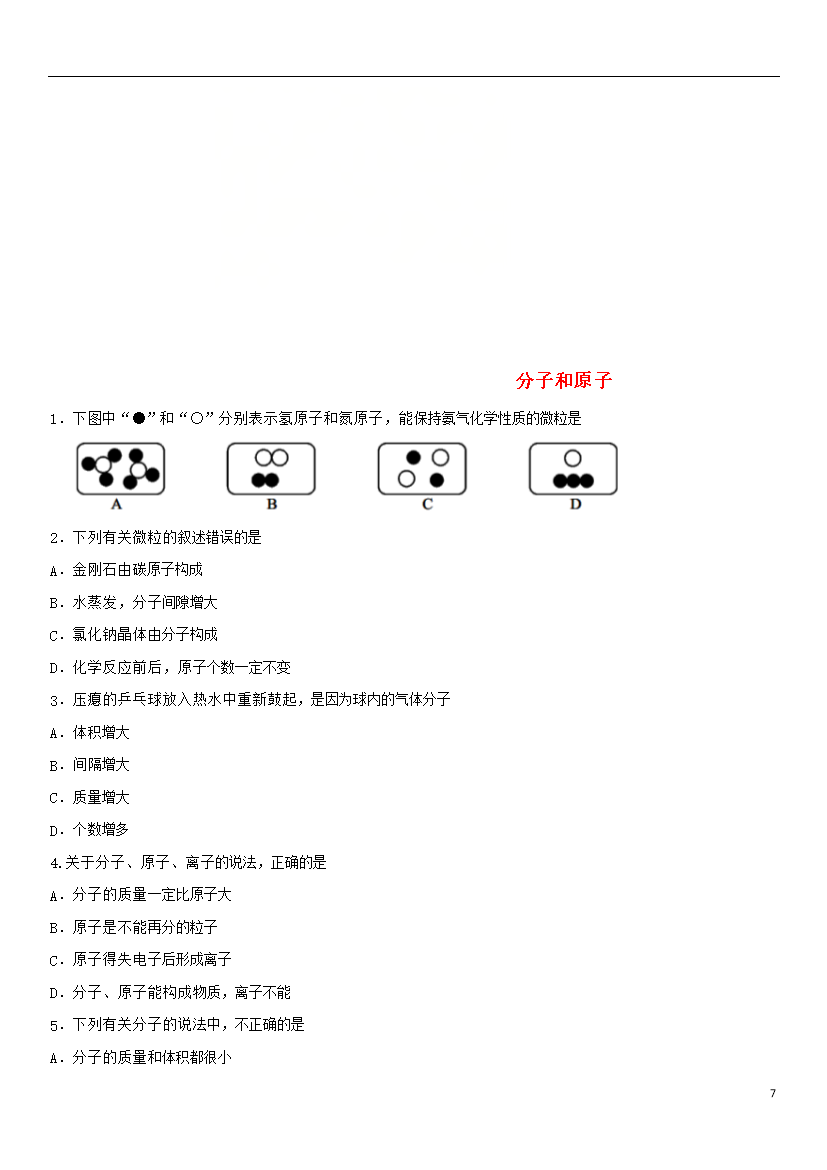 试题-全国-2018_2018年中考化学专题复习 分子和原子练习卷