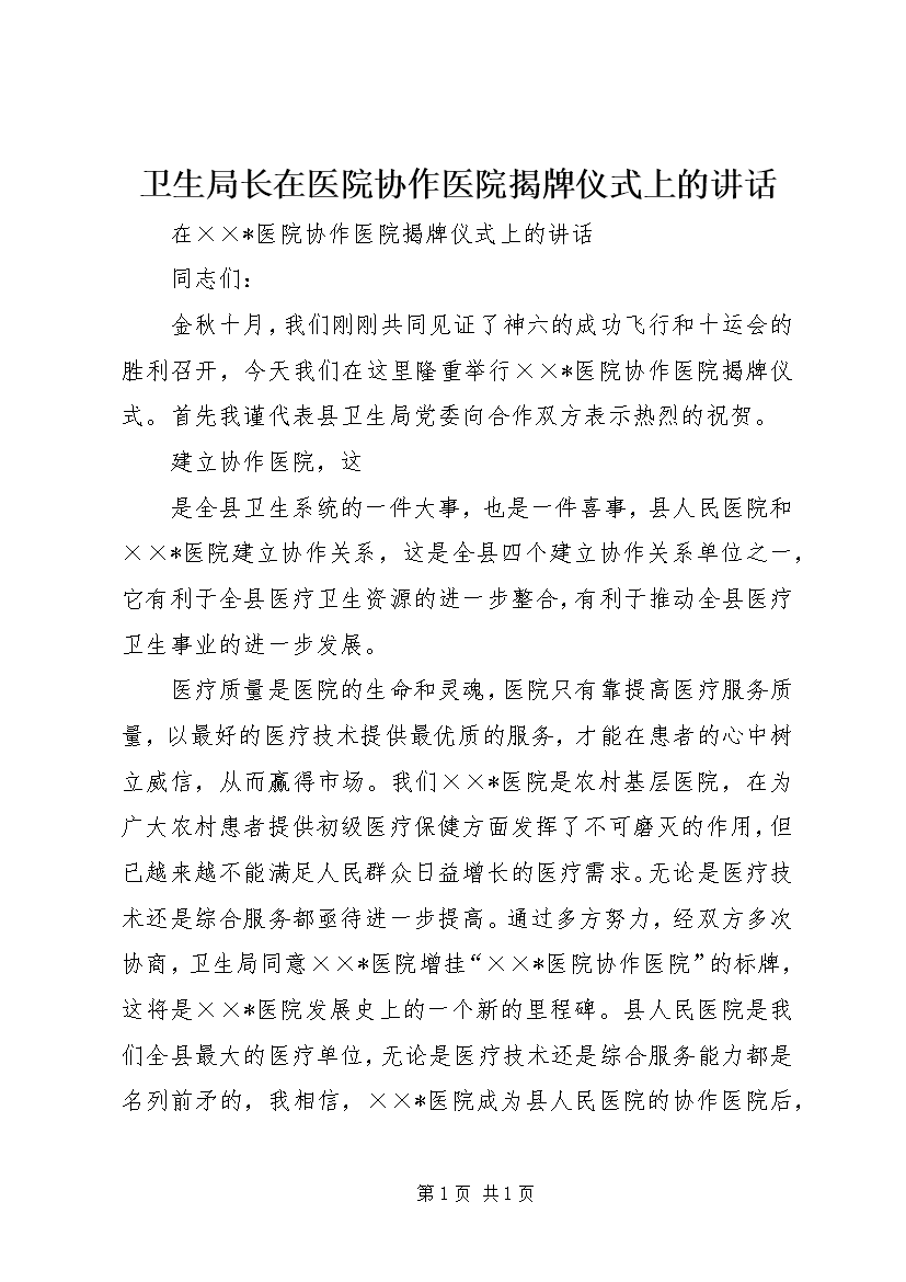 卫生局长在医院协作医院揭牌仪式上的讲话 (3)