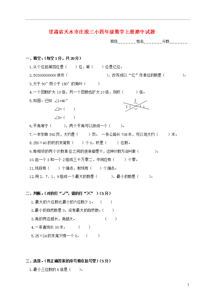 试题-甘肃-2011_甘肃省天水市庄浪三小四年级数学上学期期中试题(无答案)