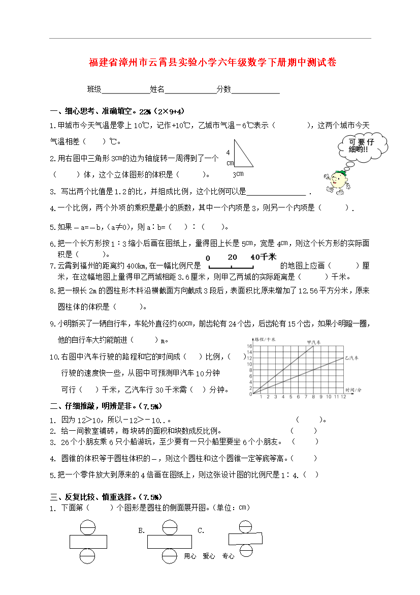 试题-福建-2011_福建省漳州市云霄县实验小学六年级数学下册 期中测试卷
