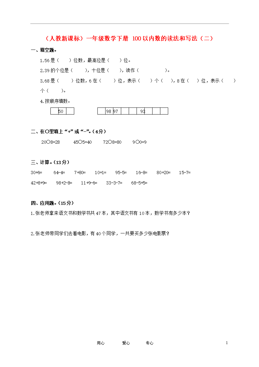 试题-全国-2011_一年级数学下册 100以内数的读法和写法(二)练习 人教新课标版