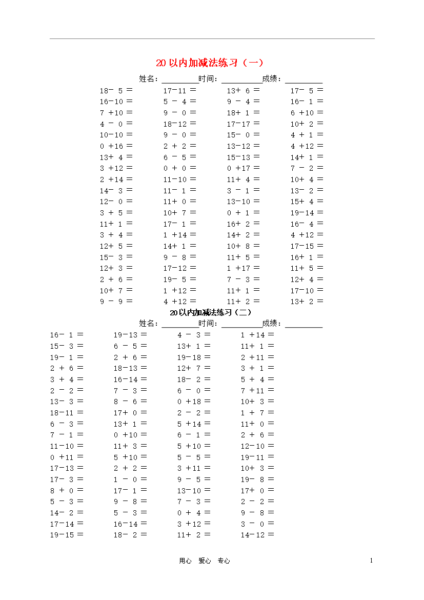 试题-全国-2011_一年级数学下册 20以内加减法练习 人教新课标版