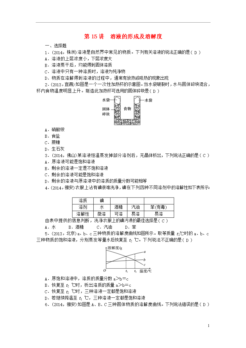 试题-全国-2014_2015中考化学总复习 第15讲 溶液的形成及溶解度考点跟踪突破