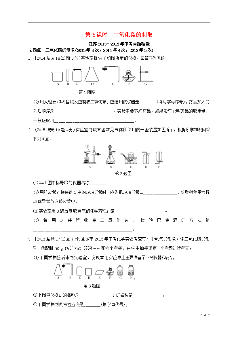 试题-江苏-2016_江苏省2016届中考化学复习讲练 第5课时 二氧化碳的制取(13-15年真题精选,含解析)