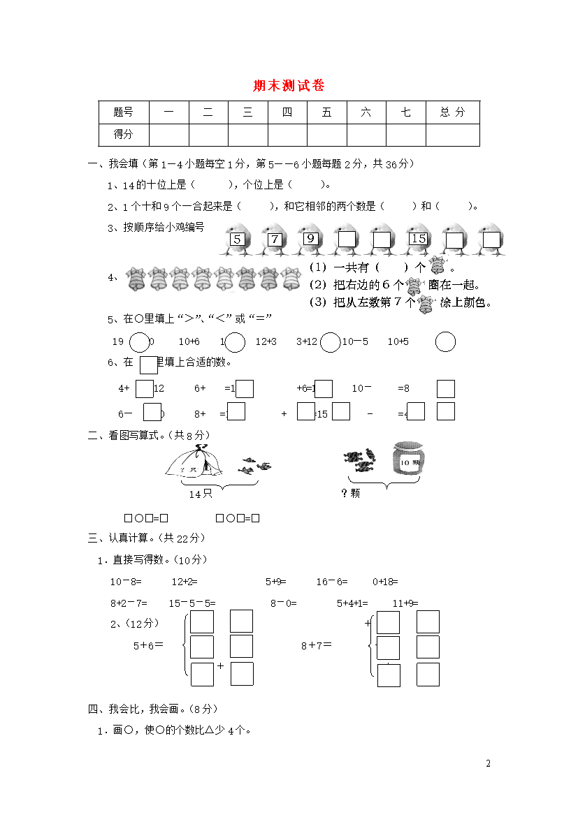 试题-全国-2019_一年级数学上学期期末试卷1(无答案) 新人教版