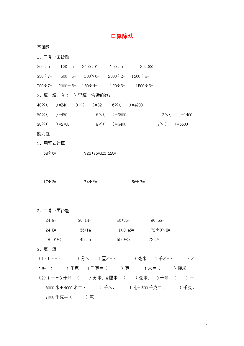 试题-全国-2019_三年级数学下册 2《除数是一位数的除法》口算除法作业 新人教版