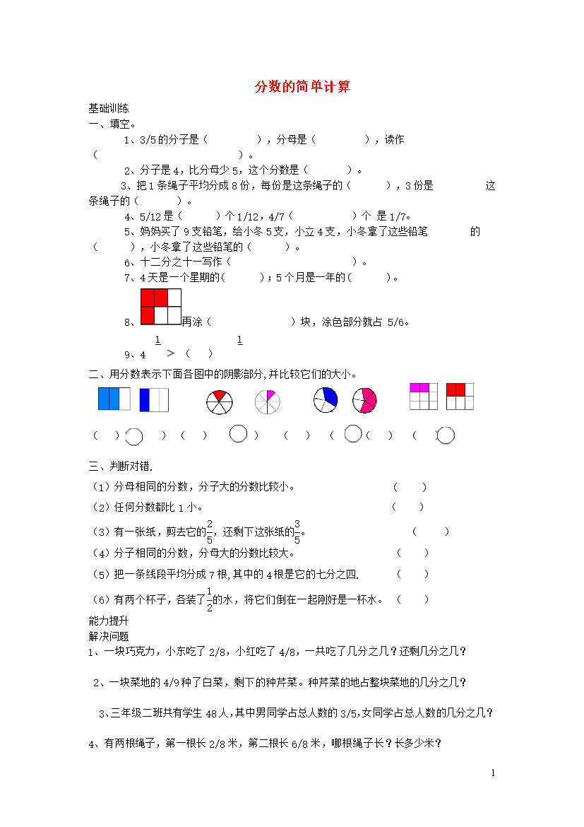 试题-全国-2019_三年级数学上册 7 分数的初步认识 1分数的简单计算分层作业(无答案) 新人教版