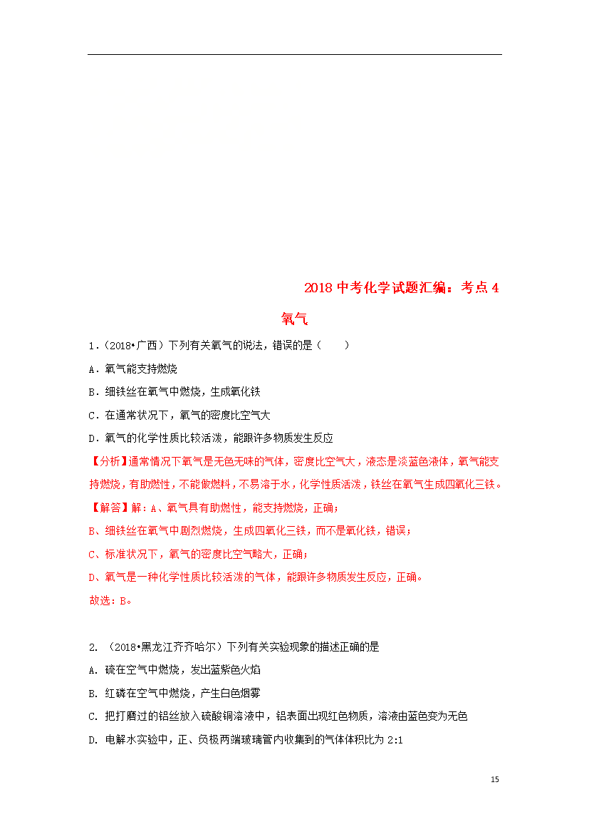 试题-全国-2018_2018中考化学试题汇编 考点4 氧气(含解析)